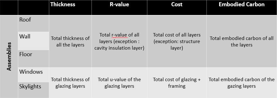 A database with hundreds and thousands of materials and predefined code compliant, generic and manufacturer specific assemblies. It was based on Uniformat and Masterformat classification, and consisted of thermal performance, embodied carbon and cost values for each material.