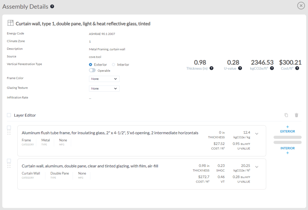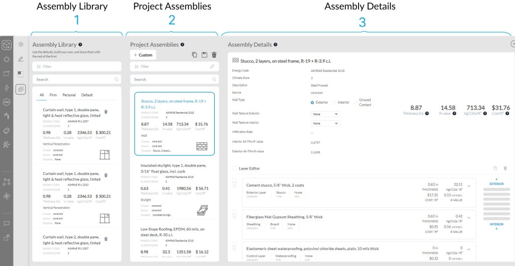 The underlying material database became a cornerstone resource for other cove.tool features, storing properties like thermal performance, embodied carbon, and cost for hundreds of assemblies and materials in a one-of-a-kind database.