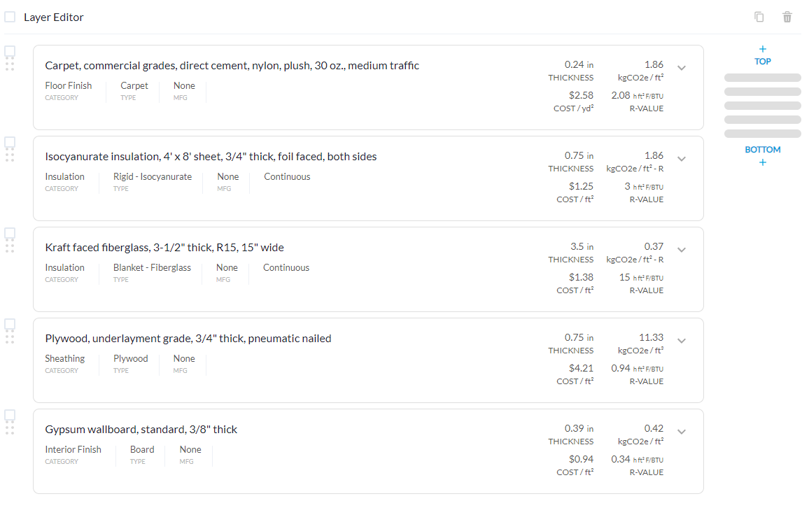 Starting from compiling feedback from users regarding pain points regarding manual, disconnected workflows, I conceptualized a tool that would let users construct building assemblies layer by layer using a visual and data-driven interface. The feature had 2 major parts:
