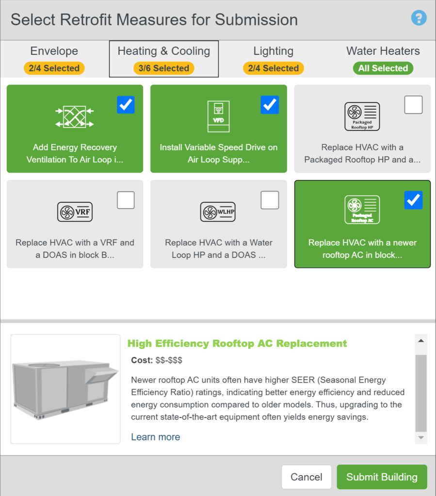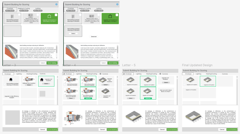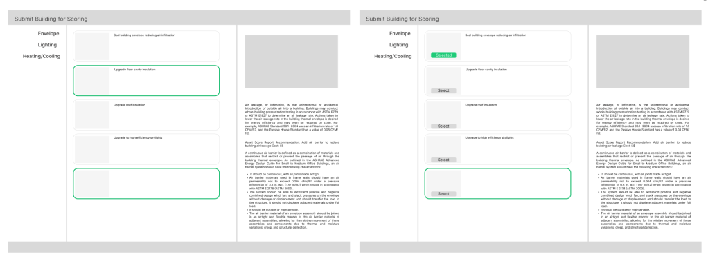 The Quick Building Assessment Tool helps users identify and evaluate Energy Conservation Measures (ECMs) for different building systems. The tool’s selection interface was based on legacy code that restricted layout flexibility and provided a poor user experience. I led the redesign of the modal dialogue box to make ECM selection more intuitive, visually engaging, and informative within the technical constraints.